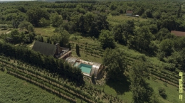 A ház nyugati oldalán, a medence partján a 40 m2-es, fedett, nyitott terasz - egyben a télikert -, lehetőséget ad a kerti sütögetésre is. Az épület nyugati teraszos részén egy 5x7 méteres, 1,5 m vízmélységű úszómedence, valamint egy 3x2 méteres, 50 cm vízmélységű kismedence található. A medencék és a terasz eltolható fedéssel tehető nyitottá avagy zárttá, melynek eredményeként április 1-től október 1-ig kellemes fürdési lehetőséget biztosítanak.